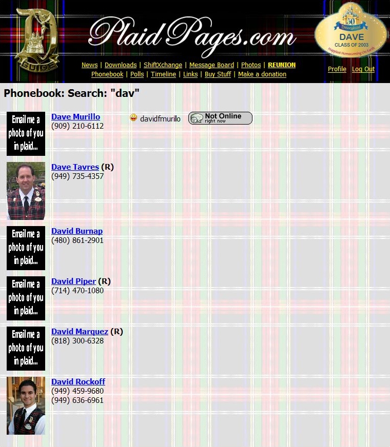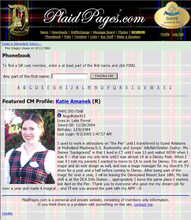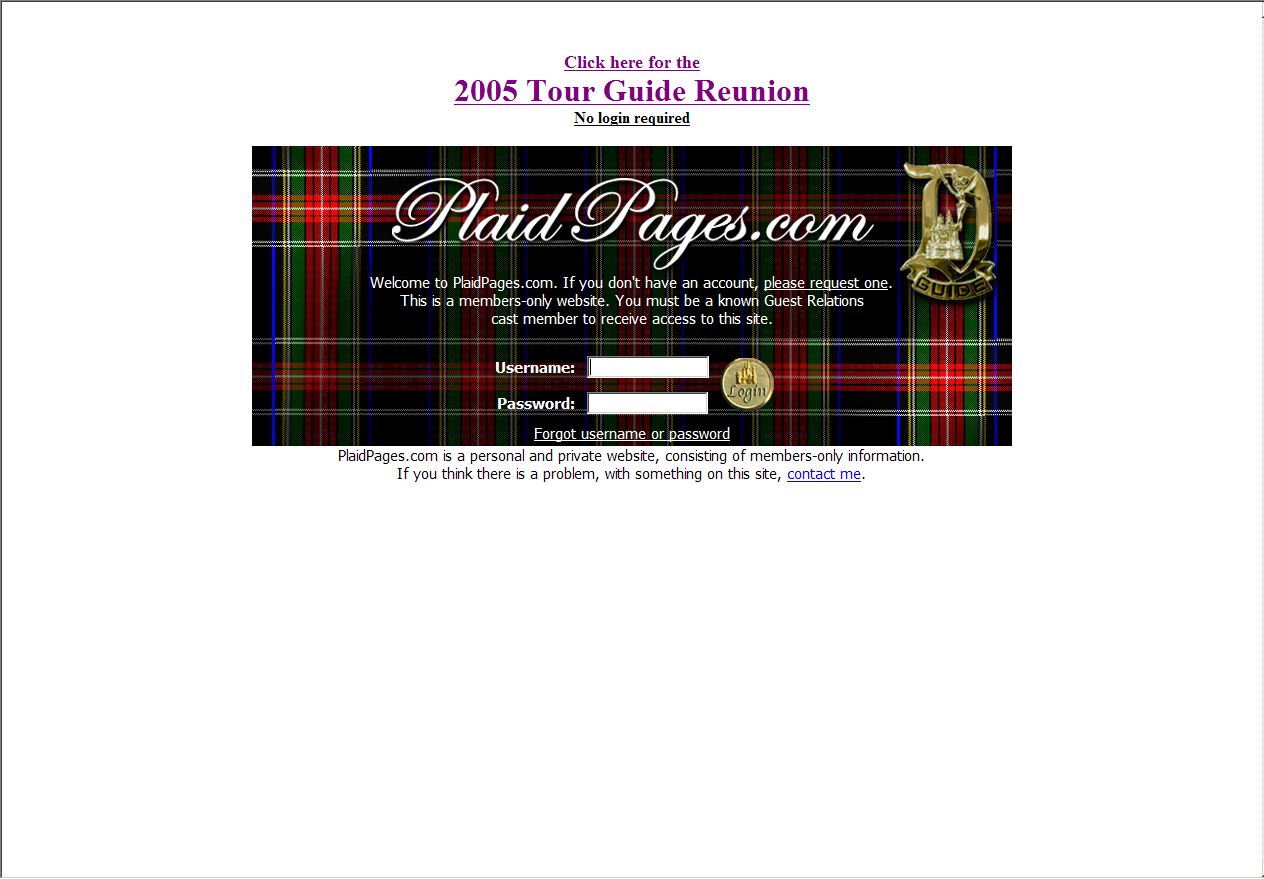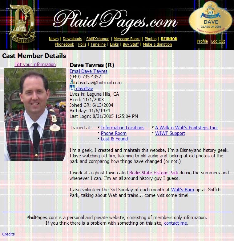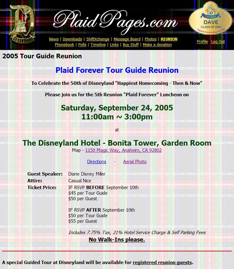 In 2003 (before facebook started) PlaidPages.com was started by Dave Tavres, as a way for Disneyland Tour Guides to connect with each other online, to share photos, exchange shifts, and share contact information for social reasons.